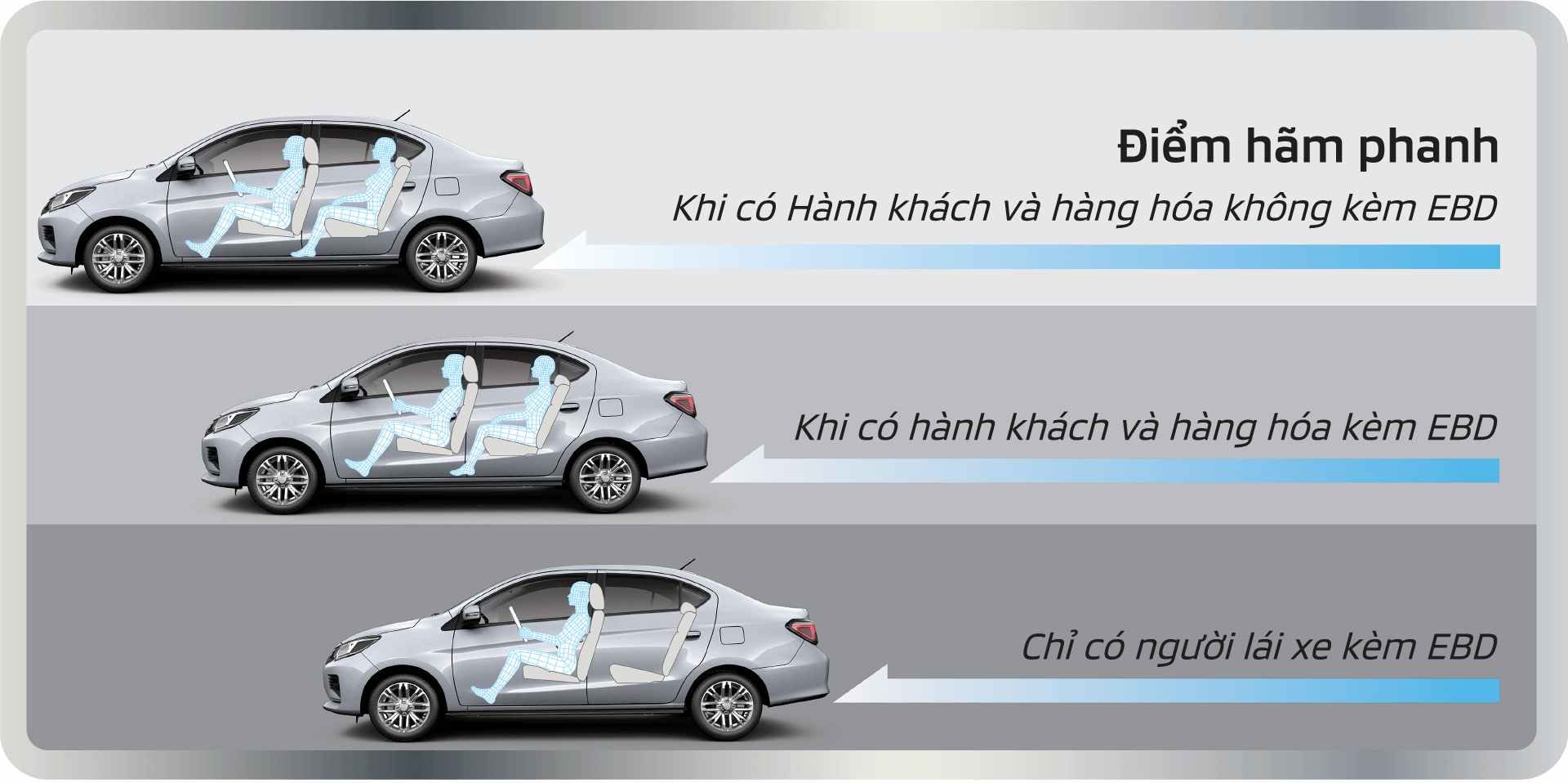 Hệ thống phân bổ lực phanh điện tử (EBD)Giúp chống hiện tượng bó cứng phanh đồng thời phân phối lực phanh tối ưu giúp làm chủ tay lái khi phanh gấp trên đường trơn trượt và rút ngắn quãng đường phanh